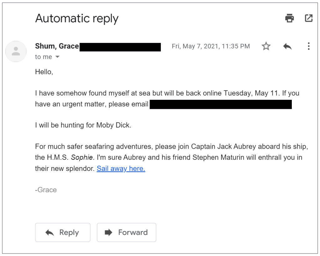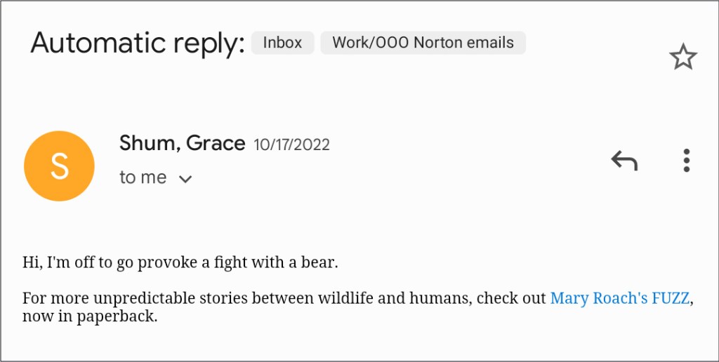 Inspired by Ryan Reynold’s out-of-office replies for his former brand Aviation Gin, I set out to make my out-of-office emails more —fun. Each message linked to a Norton title —often one that was publishing that week. The emails also tied back to the real-life reason I was taking time off. Whether I was cluelessly bobbing along my dad’s deep-sea fishing trip, referencing our competitor’s Holiday book suggestion hotline, or highlighting a family reunion, they were all honest, and I would argue, useful, out-of-office messages. I have yet to receive a complaint from upper management.
