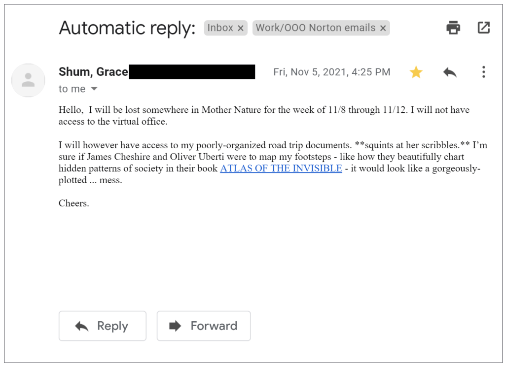 I was away on a hiking trip. Email linked to ATLAS OF THE INVISIBLE, James Cheshire and Oliver Uberti’s award-winning book of maps and infographics, which chart hidden patterns in human society. This was the email version sent to external senders.
